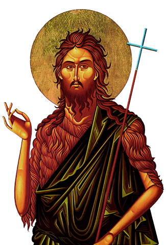 The glorious Prophet and Forerunner John the Baptist is also referred to as John the Forerunner because he was the forerunner of Christ. He was an ascetic and great prophet, who baptized Christ and became one of the most revered saints in the Orthodox Church. John is a cousin of Christ through his mother Elizabeth who was the daughter of Zoia. Zoia is the sister of Christ's grandmother. He was later beheaded by Herod in the first century to satisfy the request of Herod's stepdaughter, Salome, and wife Herodias. He is sometimes called the Angel of the Desert; because of this title, he is sometimes depicted with wings.